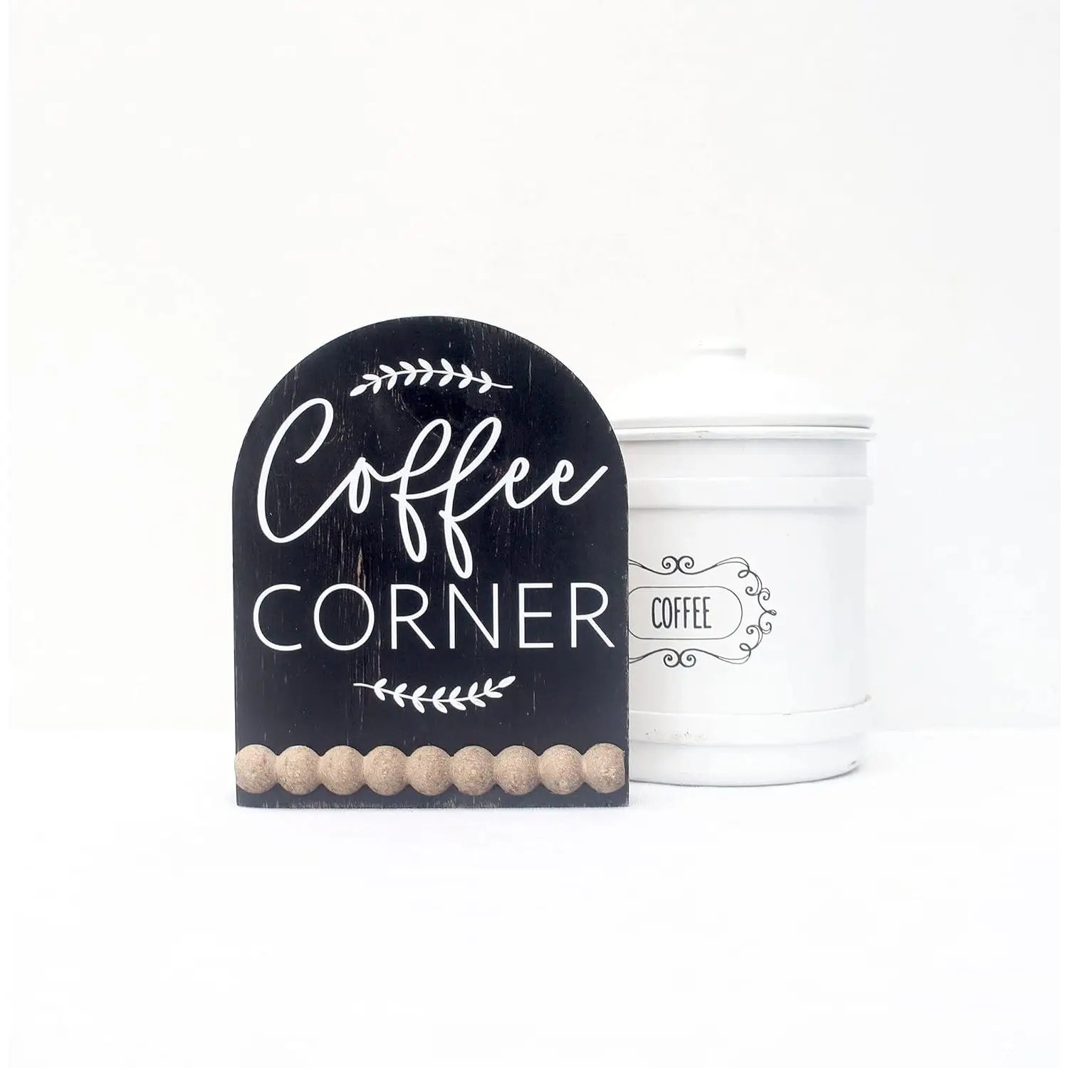 Coffee Corner Decor with Wooden Beads, Funny Coffee Sign for Bar, Kitchen, Dining Room, Home DecorAbout this item Rustic design with arched shape and wooden beads in black,high-quality wood construction Stylish quote in white typography that reads "Coffee Corner" Measures 5.5x1.38x6.88 inches, perfect size for tiered trays or tabletops Lightweight and easy to move around.Freestanding only,no hanger or hook for wall hanging. Making it the perfect statement piece to add to your coffee bar. The sign is small enough to fit on most tiered trays, or can be displayed upright on a shelf or tabletop.